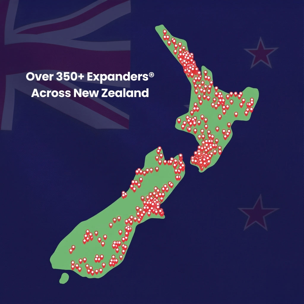 The map below provides a rough guide of Expanders® installations across New Zealand. Pin locations are approximate and may vary by ±10km.