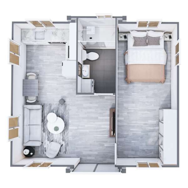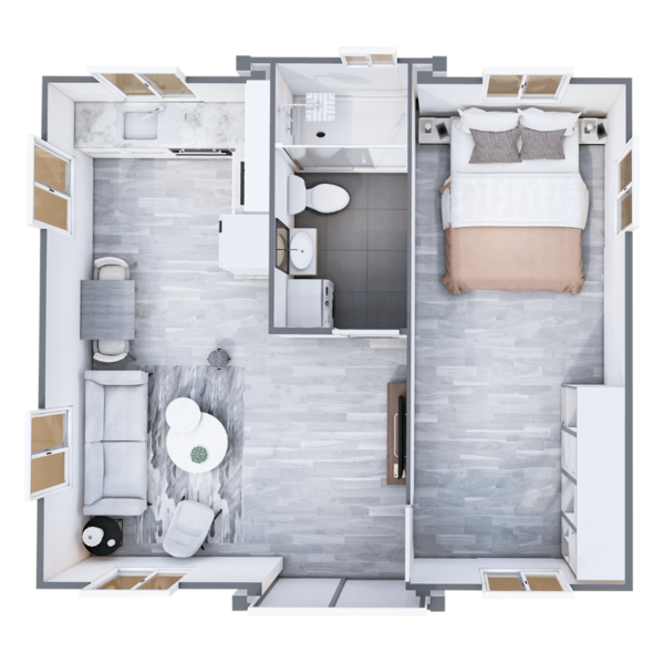 A smart 1-bedroom layout with a full kitchen, extended bedroom, complete bathroom, and ample living space — designed to maximise comfort and make everyday living easy.