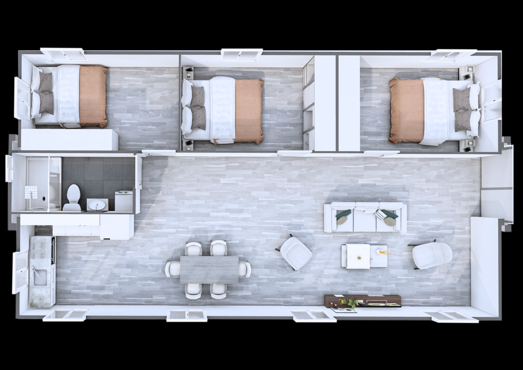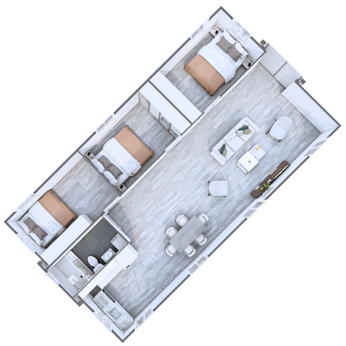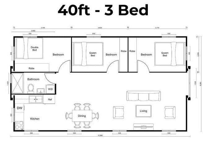 Discover the 40ft Expander – 3 Bedroom: a spacious 72m² portable home designed for comfortable family living. Featuring three separate bedrooms, a full kitchen, a modern bathroom, and generous living areas, it delivers the space and functionality of a traditional home in a smart, flexible design — ideal for families needing room to grow.