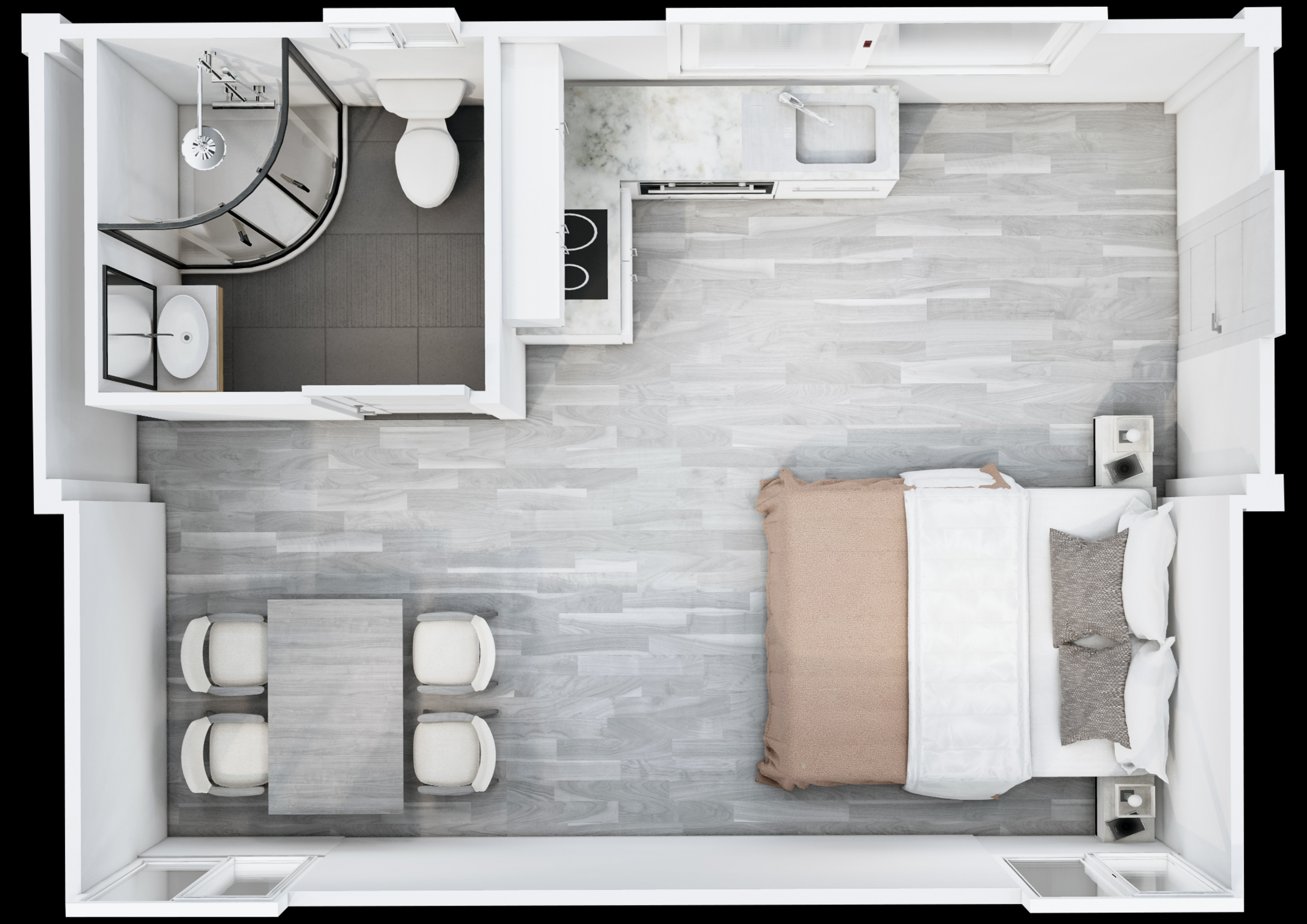 The DesignerPod™ V3 unveils a thoughtfully designed floor plan that optimally utilises its 23m² area, featuring a comfortable bedroom, a fully integrated kitchenette, and a luxurious bathroom. Bask in uninterrupted, panoramic views with DesignerPod™’s floor-to-roof glass, offering a vast 180-degree field of vision that seamlessly blends indoor luxury with the beauty of the outdoors.