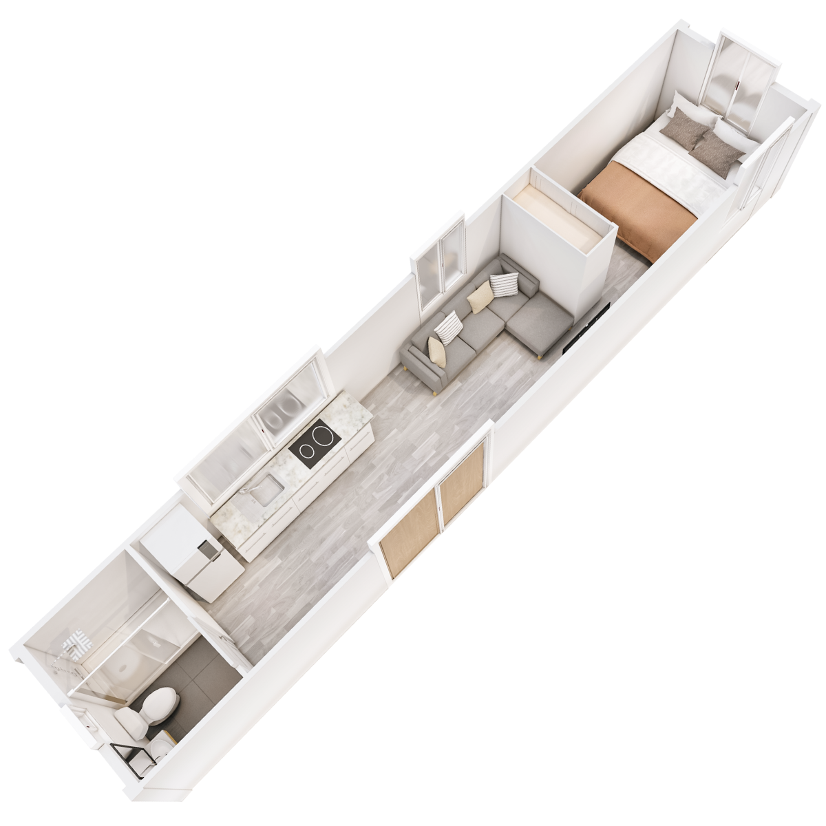 Introducing The Sanctuary: a premium 26m², 1-bedroom container home within a 40ft space. This elegant design combines a bedroom, living area, bathroom, and kitchenette, offering comfort and style. With a lockable sliding glass door and superior insulation, The Sanctuary provides year-round comfort in a sophisticated, compact home.