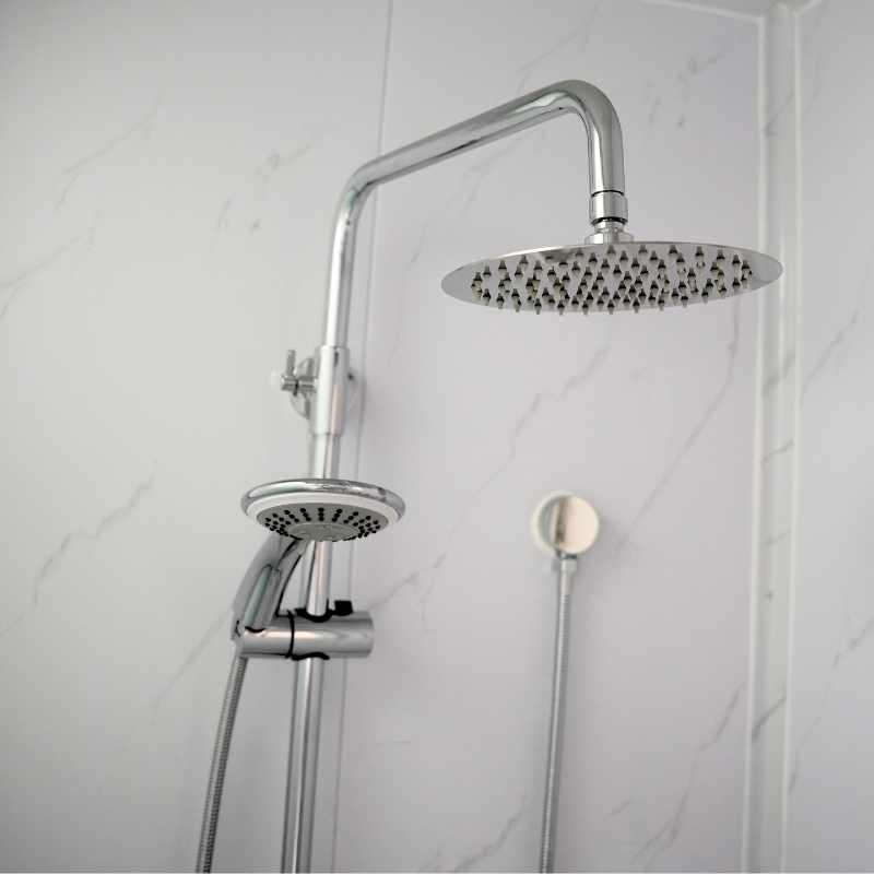 - Full-width shower, shower rail, rainmaker shower head, and frosted privacy glass door